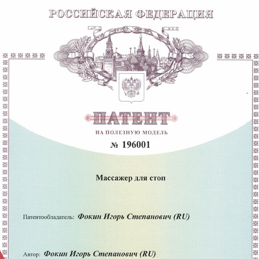 «Массажер для стоп Фокина» был запатентован как полезная модель в 2019 году. За это время по нему были успешно проведены токсикологические и биологические экспертизы. Получен Сертификат соответствия, регистрационный номер РОСС RU.З2623.ОС07.03877 от 16.11.2023г. Изобретателем и производителем изделия является индивидуальный предприниматель Фокин Игорь Степанович.